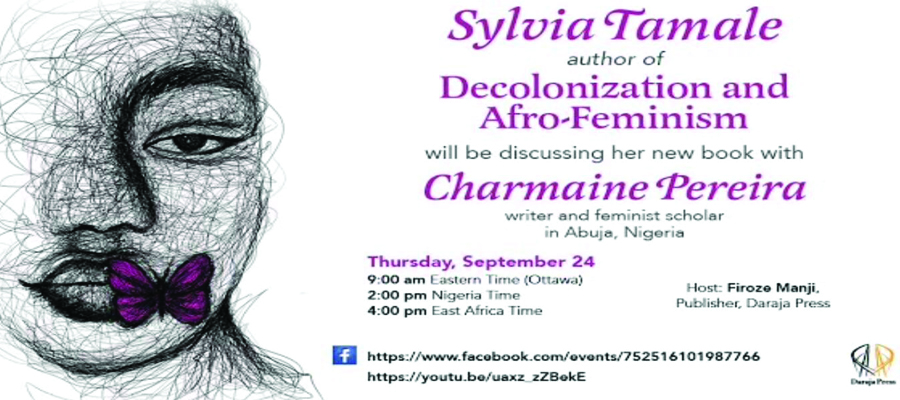 Dr Sylvia Tamale will on Thursday September 24th 2020 be discussing her newest book Decolonization and Afro-Feminism with writer and feminist scholar Charmainne Pereira. The discussion will be hosted by Fironze Manji, from publishing house Daraja Press and it will be live on both YouTube and Facebook.
