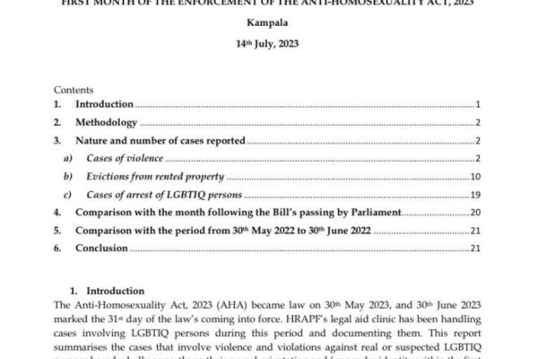 It is important to note that this report does not present a comprehensive view of the situation for LGBTIQ people across the country as it contains only the cases that were reported to HRAPF through our legal aid network, and excludes cases reported to other legal aid service providers/ handled through other channels and those not reported at all. The report focuses on cases, which are defined as a separate set of facts involving the violation of laws or rights which are included in one file. Each case can therefore contain more than one violation against more than one individual.