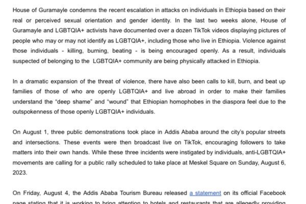 While similar increases in attacks against LGBTQIA+ communities are being reported by human rights organisations in other parts of the African continent, the escalation in Ethiopia is especially concerning due to the country’s religious history, current worsening socio-political climate, and growing nationalism.