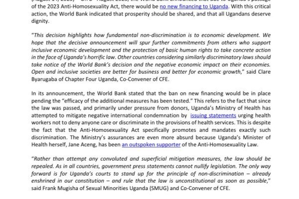 ‘Rather than attempt any convoluted and superficial mitigation measures, the law should be repealed. As in all countries, government press statements cannot nullify legislation. The only way forward is for Uganda’s courts to stand up for the principle of non-discrimination – already enshrined in our constitution – and rule that the law is unconstitutional as soon as possible,” said Frank Mugisha of Sexual Minorities Uganda (SMUG) and Co-Convener of CFE.