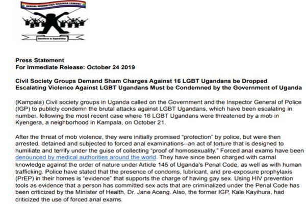 Civil society groups in Uganda called on the Government and the Inspector General of Police (IGP) to publicly condemn the brutal attacks against LGBT Ugandans, which have been escalating in number, following the most recent case where 16 LGBT Ugandans were threatened by a mob in Kyengera, a neighborhood in Kampala, on October 21.
